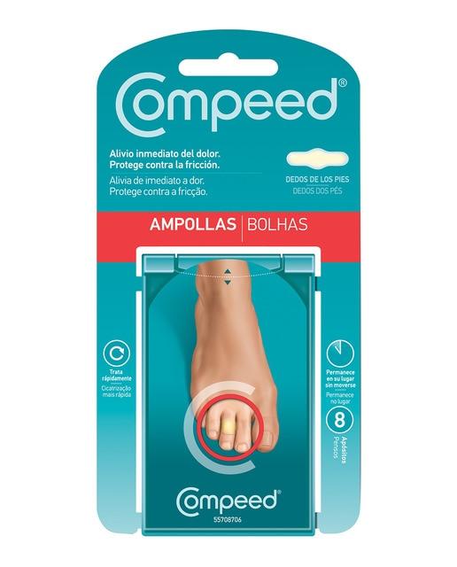 Alivio inmediato del dolor. Protege contra la fricción. La Tecnología hidrocoloide de Compeed® consta de un gel activo con partículas absorbentes de humedad. Compeed® actúa como una segunda piel que mantiene el equilibrio natural de humedad: reduce instantáneamente el dolor de las ampollas; protege y amortigua el rozamiento; permite una rápida cicatrización. Permanece en su lugar durante varíos días, pudiendo variar de unas personas a otras. Presentación: Pack 8 uds. Precauciones de uso: Los pacientes diabéticos deben consultar a su médico antes de utilizar los apósitos Compeed®. No aplicar sobre heridas infectadas. No reutilizar para evitar infecciones. Si empeora la empolla o no se cura deje de hacer ejercicio y consulte a su médico. Nunca cortar un apósito Compeed®. Los restos de adhesivo se eliminan fácilmente con un poco de alcohol, considerando las instrucciones de cuidado de cada tejido.