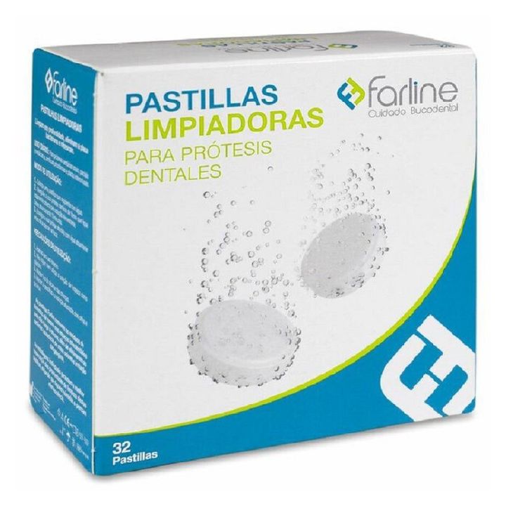 Las Pastillas de limpieza para prótesis dentales Farline 32 pastillas efervescentes permiten limpiar las prótesis a fondo, eliminar la placa y dejan un agradable frescor. Se pueden utilizar para limpiar prótesis dentales parciales (acrílicas o metálicas), ortodoncias, férulas de descarga o prótesis dentales completas.