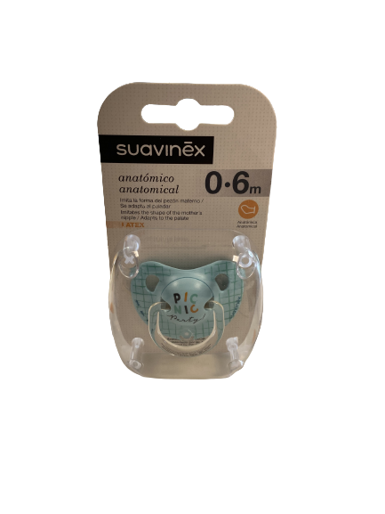 El chupete anatómico de Suavinex, con tetina de látex de caucho natural, imita la forma del pezón materno durante la succión, adaptándose perfectamente a la boca del bebé.